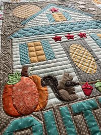 Ook hier een groot huis. Maar door leuke details in de raampjes en de dakpannen toe te voegen wordt het toch interessant. Door de wollen tussenvulling komt het quiltwerk extra mooi uit.